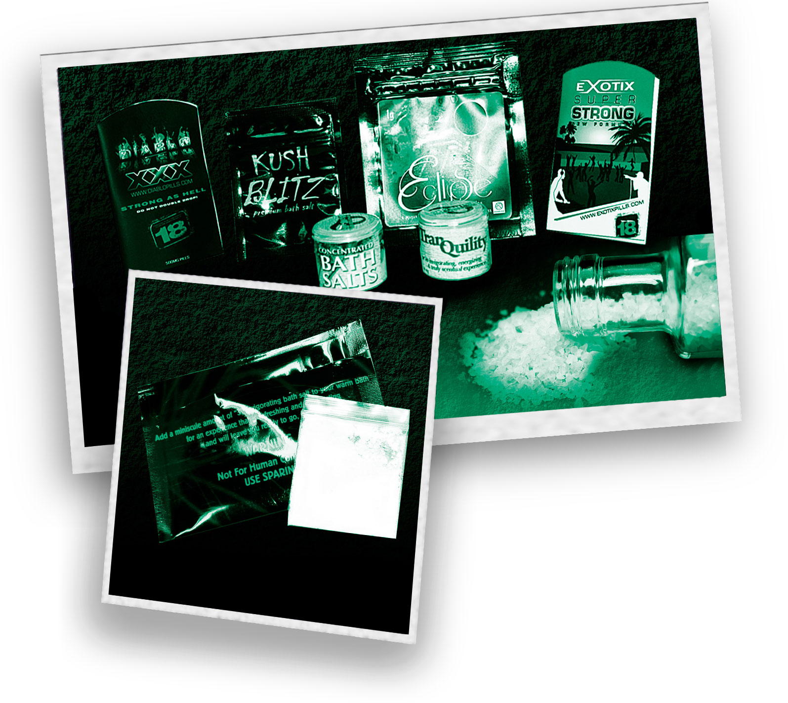 バス・ソルトには、さまざまな化学物質の混合物が含まれており、パッケージが同じに見えても、その製品に実際に何が含まれているかは誰にも分かりません。 通常は、パウダー状で、小さなプラスチックやホイルの包装で売られます。 白色や灰色、黄色や茶色で、カプセルか粒状、または小瓶に入った液体状で売られることもあります。